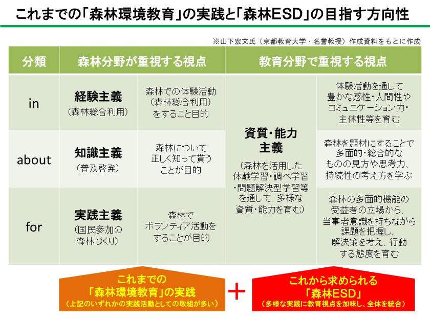 子どもの発達段階を踏まえた段階的な学びとして、環境教育では3つのタイプのアクティブ・ラーニングが求められてきました。それが、in(森林の中で/体験学習)、about(森林について/調査学習)、for(森林のための/問題解決学習)です。