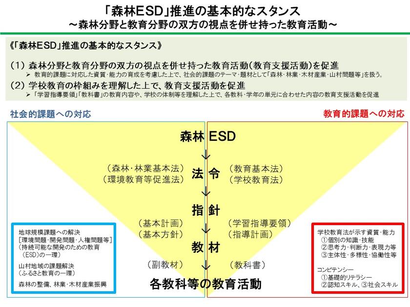 2016(平成28)年5月24日に閣議決定された「森林・林業基本計画」において、「森林環境教育等の充実」の項で、ESDの視点を考慮しつつ、教育関係者等と連携して、森林環境教育等を充実することとされました。