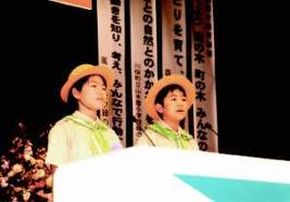 活動状況及び成果、地域社会における貢献度、将来ビジョン等が総合的に評価されて、全国から選出された緑の少年団が、全国育樹祭併催行事として行われる発表大会において、その優れた活動内容を発表し、団員相互の研さんを図っています。