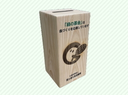 ヒノキ間伐材でできた募金箱です。「緑の募金」と「間伐材利用促進」を同時にアピールできます。 表面に団体名等の名入れができる、受注生産品です。