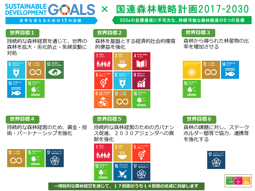森林に関する国際的に合意された目標である「国連森林戦略計画2017-2030」の中では6つの「世界森林目標」とその下の具体的なターゲット(数値目標など)が掲げられており、それぞれがSDGsのどのゴールに貢献するか明記されています。それによれば、森林分野はSDGsの17の目標のうち、14の目標の達成に貢献できるとされており、森林が世界の持続可能性に大きな影響力を持っていることがわかります。