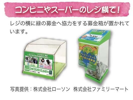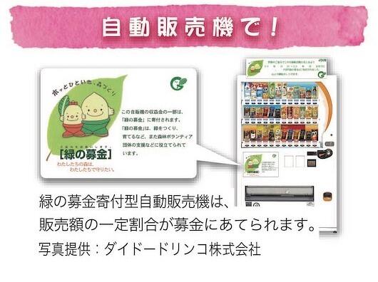 Anybody can contribute to the Greenery Donation Funds by various ways such as donation boxes on checkout counters in supermarkets or convenience stores, purchase of goods with donation, vending machines for charity and fund-raising on the Internet(on-line transfer) as well as in the neighborhood or schools.